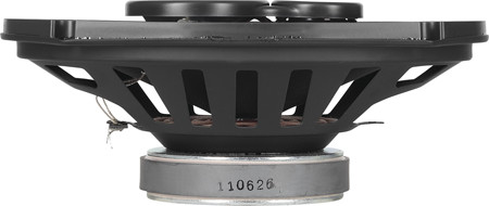 Данная модель автомобильных колонок демонстрирует некоторые отступления от общей тенденции строения автоакустики. В частности это касается диффузора мидбаса, который выполнен из целлюлозы, а сверху покрыт жестким материалом похожим на полипропилен. Роль подвеса выполняет вспененный полиуретан, ширина которого не превышает 14 мм. Как и у остальных участников теста в данной автоакустике имеются низкочастотные резонансы, расположенные в специальном диффузородержателе. Размеры магнита: диаметр 103 мм, ширина 16 мм. Под ободом корпуса установлена рама с решеткой. Звукопоглощающее кольцо выполнено из фетра и имеет оно достаточно скромные размеры. Мембрана главного твитера сделана из лакированной целлюлозы и в диаметре она составляет 53 мм. Что касается супертвитера, то он тоже электродинамический, диаметр его сбалансированного купола составляет 24 мм, большую часть которого занимает выпуклое апертурное тело. Под каждой из пищалок находится по одному конденсатору.