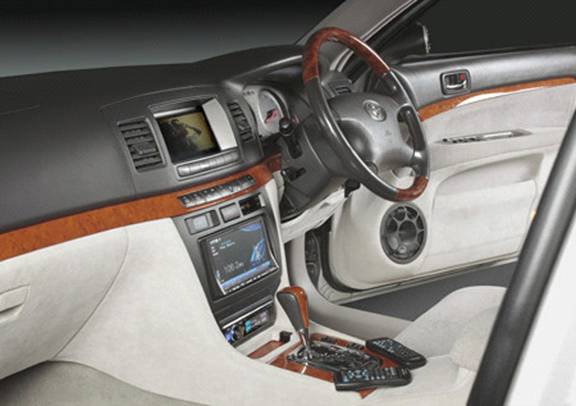 Традиционно установили фронтальную аккустику. Для мидбасов доработали штатные места в дверях, в треугольники зеркал поместили пищалки. Но в процессе подготовки салона к эксплуатации двери основательно переделали под общий стиль салона. В стиле салона господствуют накладки, кожа и особо эффектная подсветка. Особенно впечатляюще данная подсветка выглядит в багажнике. Однако этот вопрос будет рассмотрен далее.
