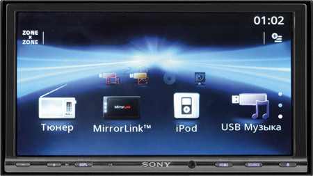 Sony являясь головным устройством, в тройке представленных новых AV, эта модель является единственной, где нет BT. У этой автомагнитолы Sony предусмотрено подключение навигации внешней с применением RGB. Меню настроек содержит 4 страницы (3 уровень). И хоть работа достаточно сложновата, но для аппарата процессорного это скорее норма. Пользовательским интерфейсом можно гордиться - он выполнен со вкусом, здесь предусмотрено просто водить пальцами, применяя виртуальные «движки». Заложен и русский вариант в меню. Настройки звуков выполняют, применяя одну из 4 предложенных позиций. Расстояния до акустики вводится упрощенно, хотя допустимо задавать и численные параметры (до 4 м, где шаг представлен 0,02 м). Частоту среза для фильтров (Rear и Front) допустимо задавать одновременно. Набор частоты одинаков, а измерения представлены параметрами 45,7/52,3/71,7/89,5/108 (Гц) (фильтр ВЧ) и 51,7/61,2/79,5/67,2/117 (Гц) (фильтр НЧ) (крутизну спада определили в13 дБ/окт.). Частоты центральные (семиполосный графический эквалайзер) имеет 63,5/163/392 (Гц) и 1,02/2,57/6,39/16,3 (кГц). Устройство способно работать с обычным выходом (двойным стерео и сабвуфером) или многоканальным (4.1), имеющим фантомный центральный канал. Предусмотрено и использование двухзонного режима, где вторая зона предполагает отправку сигнала прямо с диска. Конечно же, здесь не обошлось и без SensMe системы (патентованной), способной подбирать композиции из определенных файлов, основываясь на анализ темпа учитывая время суток. К тому же здесь реализовали систему Mirror Link связи, обеспечив качество обслуживания не только для телефонов Samsung и Nokia, а и Motorola, а также Sony Ericsson.