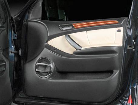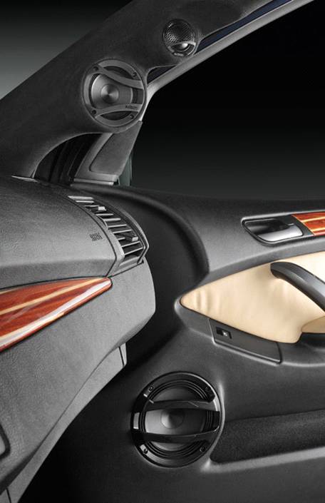 Фронтальная автоакустика пришла практически по «канбану» представляет 3-полосный комплект Audison Voce 3.0 в полнейшем списочном составе: среднечастотники AV3.0, пищалки AV1.1, мидбасы AV6.5. Динамики вмонтированы без хитростей, проверенным методом – ВЧ и ЧС в стойках лобового стекла, НЧ в двери. Двери по студийной технологии вибродемпфировали, технологические отверстия закрыли алюминиевыми листами. В стойки интегрированы опорные колечки для ВЧ и СЧ-головок, после выбора ориентации – стекловолокно, алькантара, вывод поверхностей. Отработанная процедура, практически конвейерный. Раз кольцо, два кольцо, 3-4 – стойка. Дверную облицовку переделали и обтянули оригинальными материалам вакуумной формовки. Вверху двери шпонированные вставки в оригинальной комплектации, они сохранились.