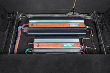 Такой Audison VRx6.4. Топовая модель, где применялась концепция Open Deck, конфигурирующая усилитель, как необходимо для этой системы даже до абсолютной нейтрализации, точнее - физического удаления из модульного тракта кроссоверов. А это - то, что необходимо. Моноблок Audison VRx1.500 и VRx6.4 из тех же брали закромов, хорошо проверяли и основательно дорабатывали, приводя к единому знаменателю: корпуса покрасили в цвет кузова и оснастили накладками из дерева от ламинированных усилителей. Полезно иметь рояль в кустах. Из 6-канальника убрали кроссоверные модули, заменили их "пустышками", увеличив ток покой в каналах А и В, функционирующих с пищалками и среднечастотниками. Функционирование усилителя в А-режиме уменьшает искажения на небольших сигналах в несколько раз, а это - то, что необходимо, чтобы улучшить проработку небольших элементов звука. С-группа и моноблок сохранились в АВ-режиме - этого хватает в басовом звене.