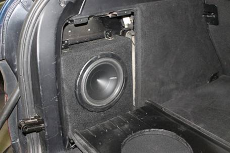 2 корпуса легко поместились под багажным фальшполом. А для закрепления успешности в экономии объема багажника, саб решили заменить двумя сабами. Тут без парадоксов: 2 небольших, 8-дюймовых, каждому необходим малый объем, имеющийся по бокам багажника. 1-им куском не удалось бы найти равный объем. Для 8-юймовых головок Hertz ES200.5 сделали закрытые 10-литровые корпуса, динамики соединили параллельно. Корпуса вмонтировали в бока багажника за штатными крышками, где врезали защитные сеточки. Для освобождения места под сабы, перенести часть блоков стандартного электрооборудования.